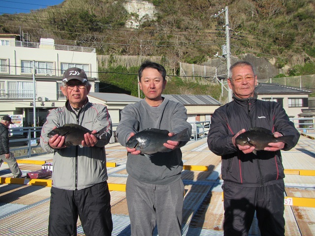 自由釣行 南房総市白浜 白浜渡船 釣行者:関根会員・中山会員・森田会員 連休初日の凪を見定め、上記の関根組が白浜渡船に出撃し高島に渡り、陸向かい先端に森田会員が入り、関根会員と中山会員は沖向かいに入ったようで、早々に森田会員が中型のイシダイ♀56.0cm/3.35kgをGet!したようですが、後が続かず・・・・・沖向かいもイシダイからの挨拶はなく、定刻(11:30)にて終了したようでした。お疲れ様でした! 白浜渡船さん前にて記念撮影がコチラ! |
