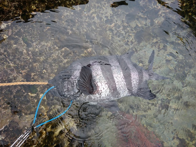 自由釣行 鴨川市太海 新海荘 釣行者:平松 たまには一人で?と言う事で、エサの調達を兼ねて単独で太海に出撃!、凪が良く多くの釣人(ルアーマン)が新海荘前に集結し、イシダイ釣り師の肩身が狭いこと、ルアーマン約20名でイシダイ釣り師は4名、先にルアーマンを磯場に渡し、イシダイ釣り師は3番船での渡船となりました。 野田から来ている2名のイシダイ釣り師が貝溜に渡り、私は単独でヨシガ島に渡り、もう一人は平島に渡ったようでした。渡礁した当時は逆潮がトロトロ効いていましたが、暫くすると逆潮が激しく流れ・・・と同時にあたり一面濃霧が立ち込め30m先が見えないほど、凪で良かった!こんな時に時化てきたら!撤収すらできない状況だったから、、、逆潮が効きすぎるので仕方なく竿下にコマセ(ジンガサやフジツボ)を投入するも、時折エサに反応するイシガキダイのチビ位、そうこうしている内に霧も晴れ、少し汐の流れも弛んだ様なので、いつものT字路に仕掛けを投入、暫くすると元気の良い反応があり、上がってきたのはイシガキダイ33cm/1.0kgでした。その後は殆ど反応もなくなりましたが、少し東寄りの風が吹き凌ぎやすくなったので、12時まで頑張りましたが後が続かず終了となりました。朝のうちは蒸し風呂のようでした、暑さ対策を万全にしないと、私の大切な釣り仲間から「干からびていない?大丈夫ですか?」と何度も連絡があり、仲間の友情にまたまた感謝の今回でした。ありがとうございました!無事に帰ってきました。 |