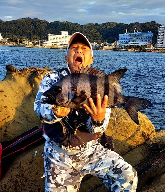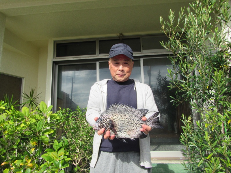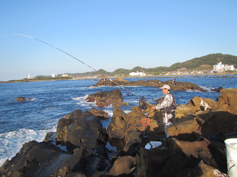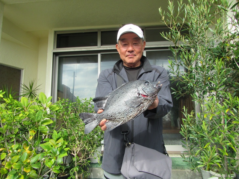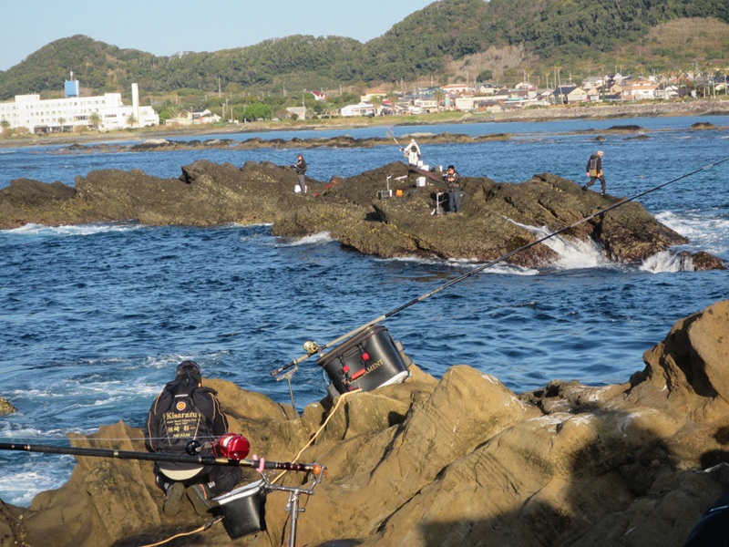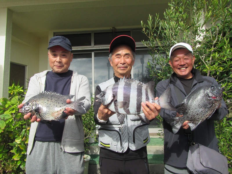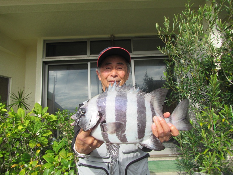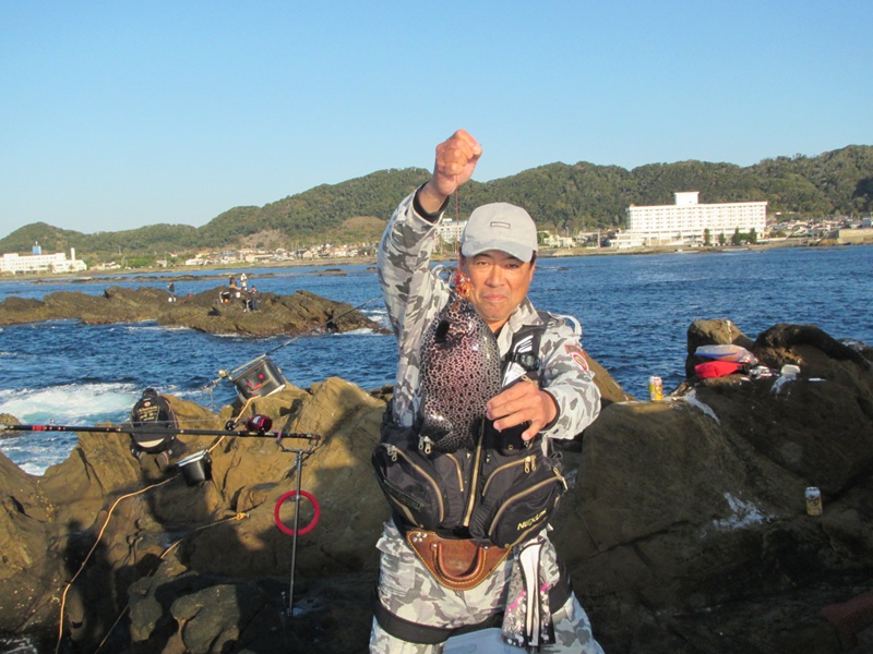 自由釣行:鴨川市太海 新海荘 釣行者:葛島副会長・岡本会員・鈴木会員・友人 連休初日の凪を狙って、上記の会員が太海に出撃!無風のベタ凪で、4名で沖磯の小島に渡り、エサ取りも頻繁に竿を抑え、暇なく遊べたようでしたが、鈴木会員が大きそうなイシダイをバラシた位で、葛嶋副会長が正面左の高台で、小型のイシダイ41.0cm/1.60kgと良型のイシガキダイを釣ったようでした。 その他の会員は良型とまでいかない30cm~40cmの手前のイシガキは結構釣れたようでした。 今日は全くの無風状態で、蒸し風呂かサウナに入っているようで、とても辛い思いをして辛抱堪らず、11時には終了し撤収したようでした。お疲れさまでしたぁ~~~! 明日は南寄りの風がやや強く吹く予報ですので、明後日の15日には、私もイシガキ釣に出かけようと思っています。頑張ろ~~~! |