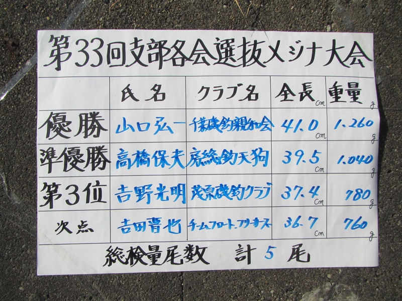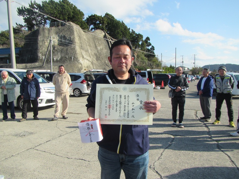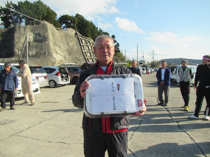 東日本支部 各会選抜メジナ釣大会 富浦地区 鳴釜渡船 参加者:平松・石井会員・石渡会員・関根会員・中山会員・恒崎会員・岡本会員 先週の1月11日の開催予定が時化の為延期となり、凪のよい本日の開催となりました。比較的に暖かい朝で、良い一日になる気配でまだ暗い中、岡沢支部長の挨拶によりスタートしました。 我がクラブ員の磯割は、私と石井会員・中山会員が鮫島で、増間のハナレには関根会員と岡本会員が渡り、石切り場下には石渡会員、そしてモッソーには恒崎会員が渡りました。 朝の内はさほど風も無く釣りやすい状況でしたが、徐々に北寄りの風が吹き出し・・・徐々に寒さが増してくるようでした。私とすれば11月の末に釣行して以来、毎週時化模様の為納竿もしないまま年を越した感じで、何十年もない経験でした。ですから久しぶりの釣行で、着る物を選ぶのに手間取った感じでした。 開始早々は、寒いながらも小魚のエサ取りは頻繁で、私の狙っているカワハギ以外は良く針に掛り、ミナミハコフグ・ベラ・イシダイ・イシガキダイ・カサゴ・キタマクラ等など・・・・ 増間のハナレに渡った岡本会員がクロダイを釣ったようで、その後鮫島の石井会員もクロダイを釣り嬉しそうでしたが、今日はメジナの大会なので頑張ってメジナ!を狙っているのでしょうが、中山会員も掌サイズのメジナがやっと一匹釣れただけで、鮫島ではメジナの姿はありませんでした。そしてこの周辺は日当たりが悪く10時頃に日があたりだすと、いままでのエサ取りが嘘のように居なくなり、餌が残って来るようになり、ほぼ皆諦めムードに突入・・・木更津磯の例会だったらとっくの昔に終了するところですが、そこは支部の大会だから終了時間まで何とか頑張ったものの、10時以降は全く変わらない状況でした。 13時前には終い支度を整え、迎えの鳴釜渡船さんに乗って帰港となりました。 こんな中でも、20数名の参加者がいれば、しっかりメジナを釣ってくる猛者がいて、優勝には千葉磯釣親和会の山口 弘一氏、 準優勝には房総釣天狗の高橋 保夫氏、 第3位には茂原磯釣クラブの吉野 光明氏で、 大会結果はコチラになります。 表彰式終了後の大抽選大会では、多数の商品が協賛されまして、その中でもキャスティング賞にはチームフロートフリーカーズの多田 靖浩氏が当たり、和気藹々の内に大会の終了となりました。 支部役員の皆さん・御協賛を頂きました皆さん、お陰様で事故もなく無事に終了できました、皆皆様の御協力に感謝申し上げます。 |